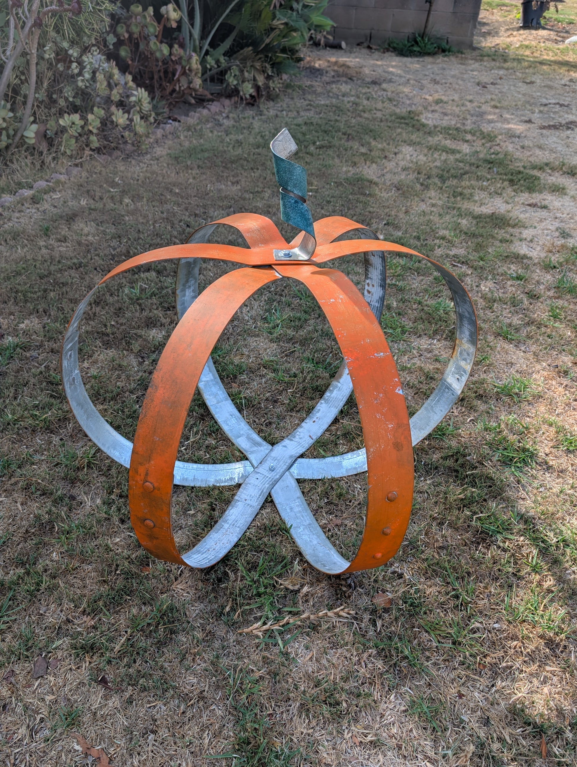 Bring the charm of Napa Valley to your home with our stunning galvanized steel pumpkin lawn ornaments! Standing at 2 feet tall (including the whimsical stem), these unique pieces are crafted from reclaimed wine barrel hoops, making each pumpkin a one-of-a-kind treasure.